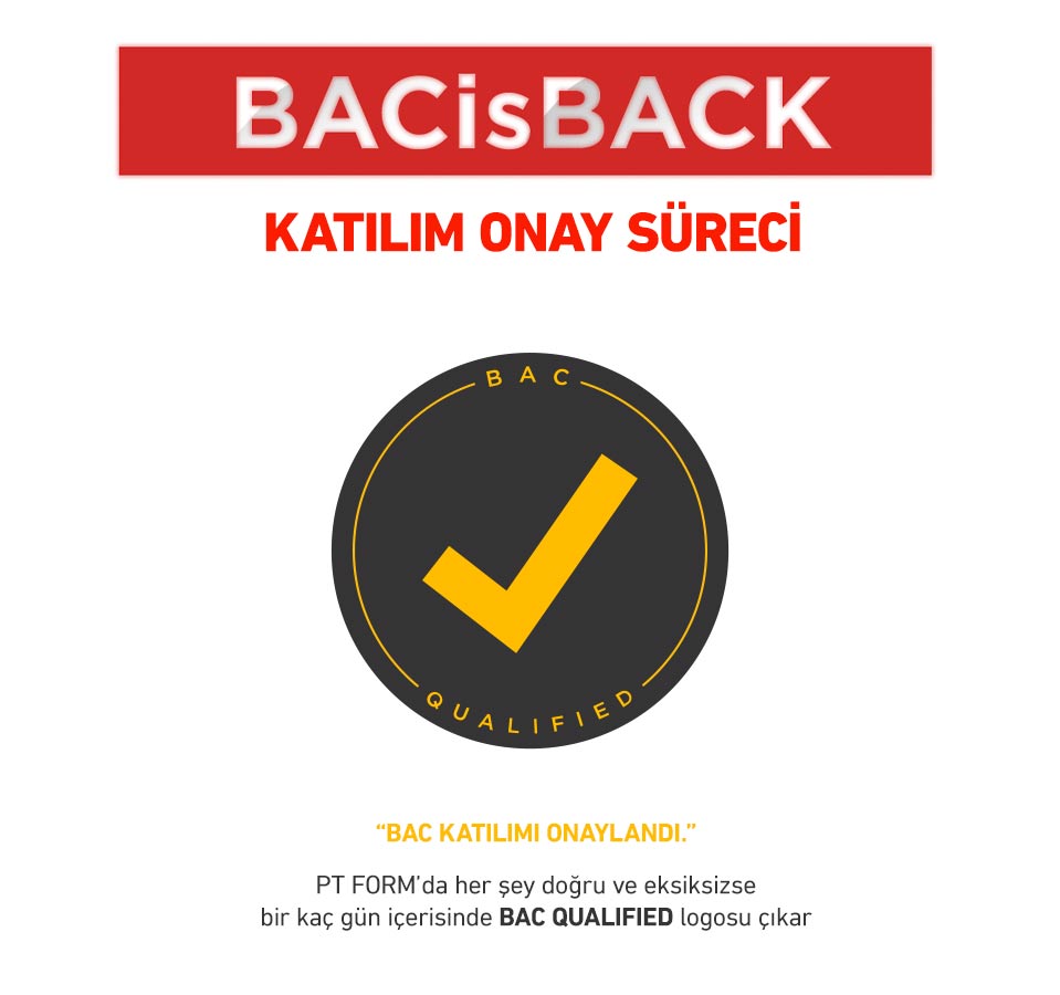 PT Form eksiksiz ve hatasız doldurulduktan sonra, gönderilen formlar tarafımızca incelenir ve onaylanır. Eğer PT Form eksiksiz ve doğruysa, profil sayfanıza "BAC QUALIFIED" simgesi gelir.