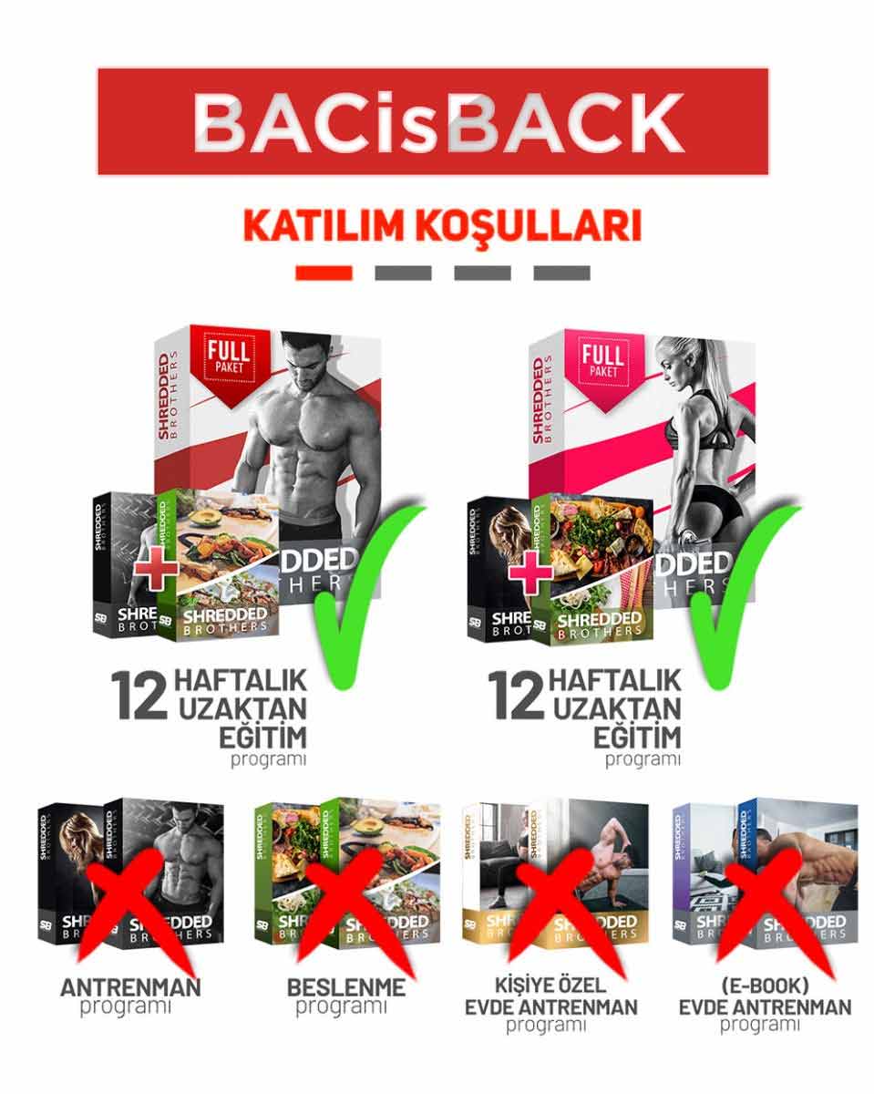 Mevcut olan indirimden faydalanıp, 12 Haftalık Evde Antrenman Programı satın alabilirsiniz, fakat BAC’e yalnızca 12 Haftalık Uzaktan Eğitim Full Paket ile katılabilirsiniz. Dilerseniz 12 HAFTALIK EVDE ANTRENMAN programınızı dondurabilir. 12 Haftalık Uzaktan Eğitim Full Paket satın alarak BAC’e katılabilirsiniz. BAC bittikten sonra istediğiniz zaman 12 Haftalık Evde Antrenman Programınızı kullanıma açabilirsiniz.