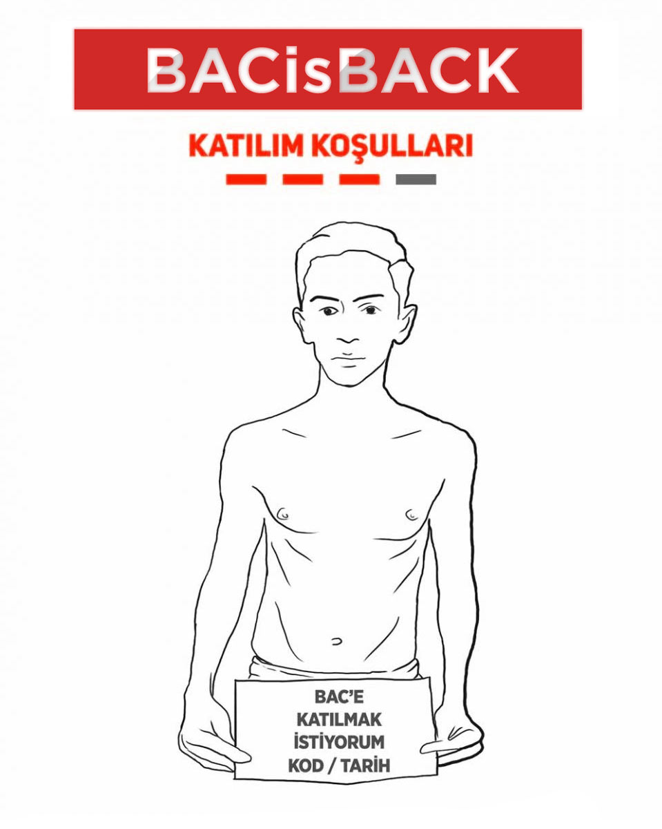 Fotoğraf çekilirken elinizde size verdiğimiz ‘’KOD’’ ‘’BACisBACK’’ ile o günün tarihinin ve "BAC'e katılmak istiyorum" yazılı kağıt PT FORM’una eklenmelidir. Kayıt olduktan sonra BAC Start tarihini biz size vereceğiz. 30 günlük kayıt döneminde programlarınızı hazırlayacağız, herkesle aynı anda programlarınızı BAC Start tarihinde kullanıma açacağız.